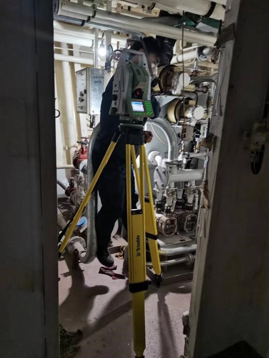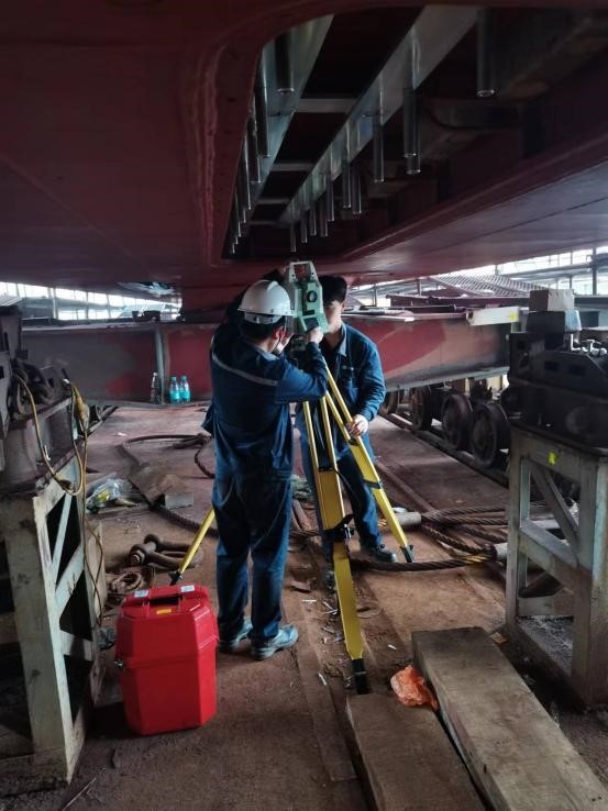 针对任务难点,团队多次研讨,制定了严密的技术方案,并开发出相应数据处理软件。现场工作期间,许方正与干明义克服诸多突发情况,安全高效地完成了精密测量任务,为智能无人船如期顺利下水奠定了坚实的基础。