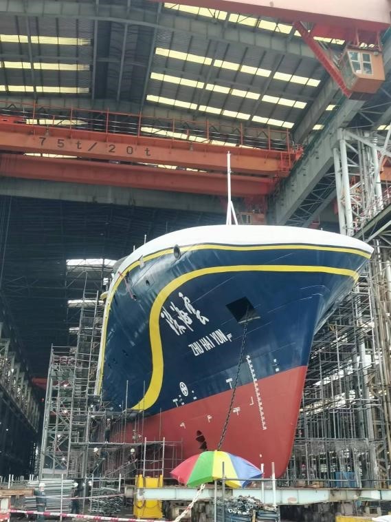 2022年5月18日,全球首艘智能型无人系统母船“珠海云”在广州下水。在下水前,北海试验场团队成员博士生许方正和本科生干明义为其提供精密安装测量技术支持。