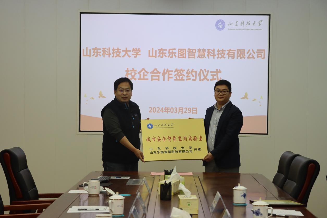 座谈会上,涂锐和陈绪军分别代表双方签订《校企合作协议和创新教育基金捐赠协议》,山东乐图智慧科技有限公司向学院捐赠创新教育基金8万元,王荣超代表学校颁发捐赠牌,王瑞富和陈绪哲为双方共建的“城市安全智能监测实验室”揭牌。