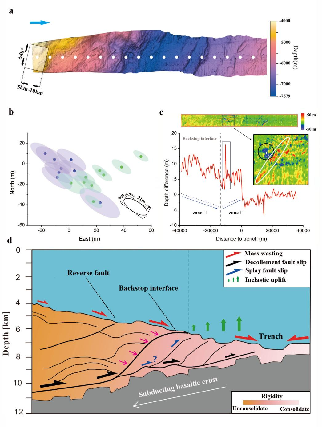 研究的分析结果表明,主震区靠近海沟处的同震形变具有显著的空间异质性。水平方向上,海底滑动位移幅度达30米,并向海沟方向消减(图2b)。由此引发的海底同震抬升效应引起了强烈海啸,且海底抬升幅度亦沿向海沟方向呈现减弱趋势。然而,该趋势在背冲逆断层附近发生反转,转而表现为向海沟增长的特征(图2c)。上述发现中,海底水平滑移与海床抬升幅度的显著背离大异于经典的地壳弹性形变模型,揭示了海沟处松散沉积物组成的增生楔状体在地震中所产生的显著塑形同震形变效应(图2d)。该效应在海底同震抬升过程中的主导作用,为进一步揭示俯冲型地震中的大规模海啸诱发机制提供了重要线索。
