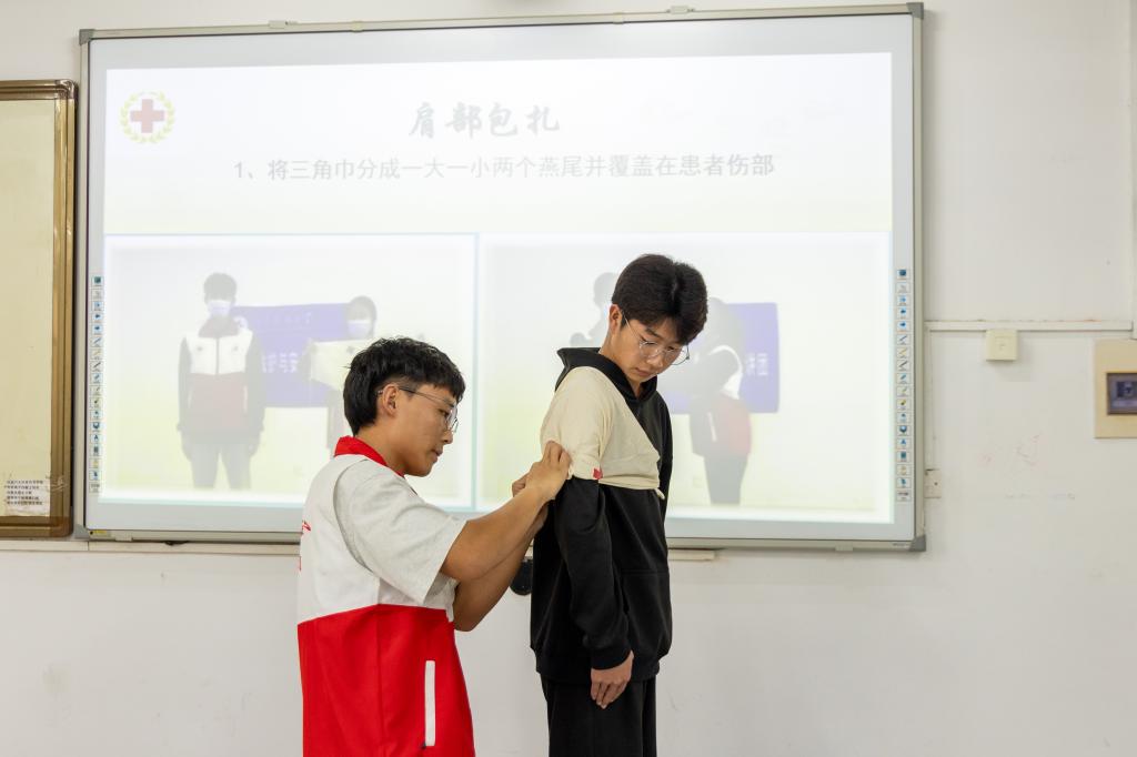 红十字会应急救护与安全避险宣讲团进行宣讲,主要围绕血压测量、常见意外应对措施、心肺复苏与包扎止血四个方面进行。宣讲人员详细演示了心肺复苏的操作流程及体外除颤仪的使用,并创新性地结合音乐《最炫民族风》,帮助同学们更直观地感受胸外按压的频率和节奏。最后,在包扎止血讲解环节,宣讲人员演示了针对胸部、肩部、手部及头部的基本包扎止血方法,并邀请同学们担任模特参与演示。活动中,同学们积极配合,二人一组,踊跃上台练习。