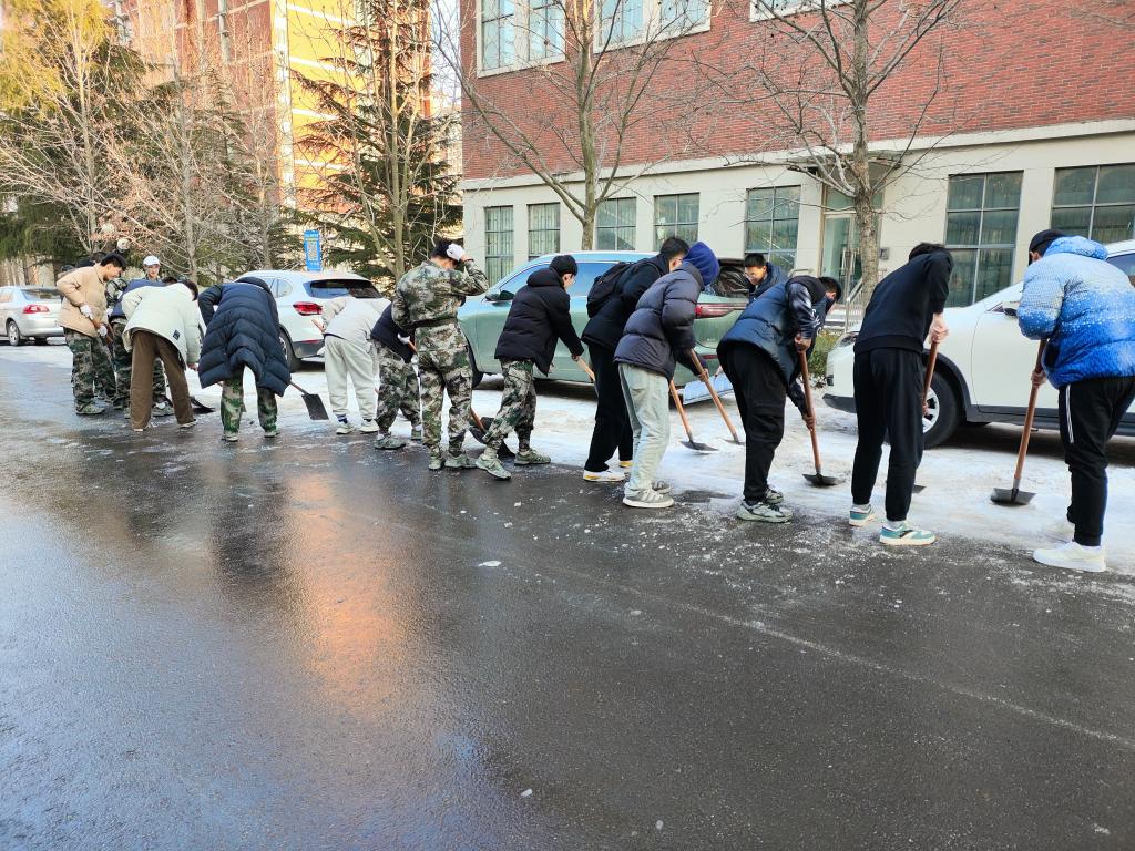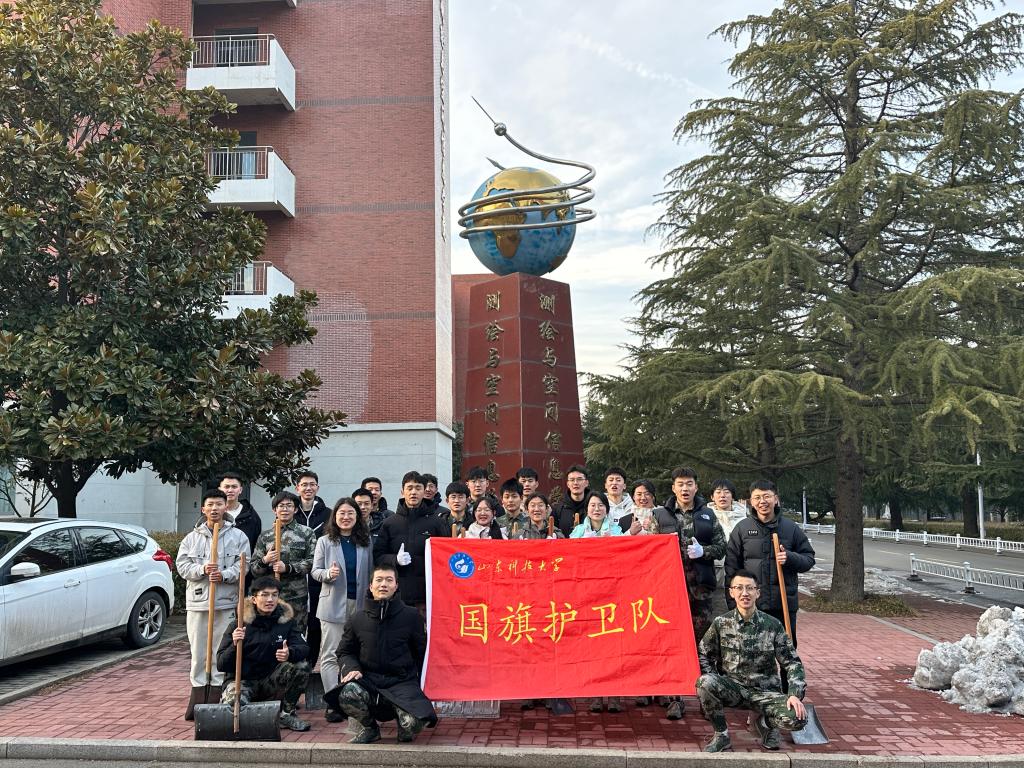 2月26日下午,为保证升旗质量和服务师生出行,国旗护卫队党支部、社团在泰山广场和校园内联合开展扫雪除冰活动,国旗护卫队党支部书记孙金香、国旗护卫队指导老师韩冰参加活动。