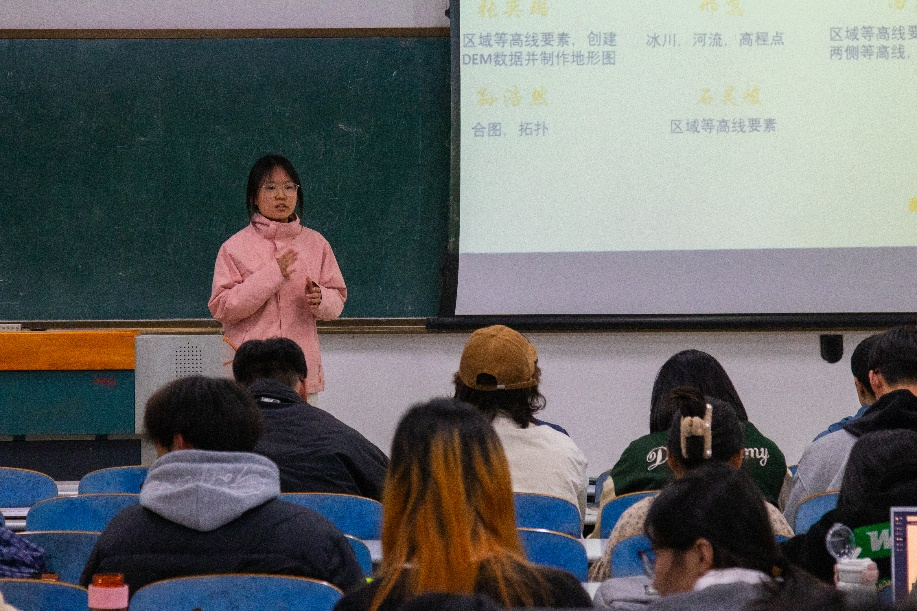 地理信息协会开展寒假作业讲评活动,本次讲评中,每个小组需要派一名汇报人上台展示作业成果,由牟乃夏老师、信睿老师以及部分协会成员组成评委团对小组进行打分评比。