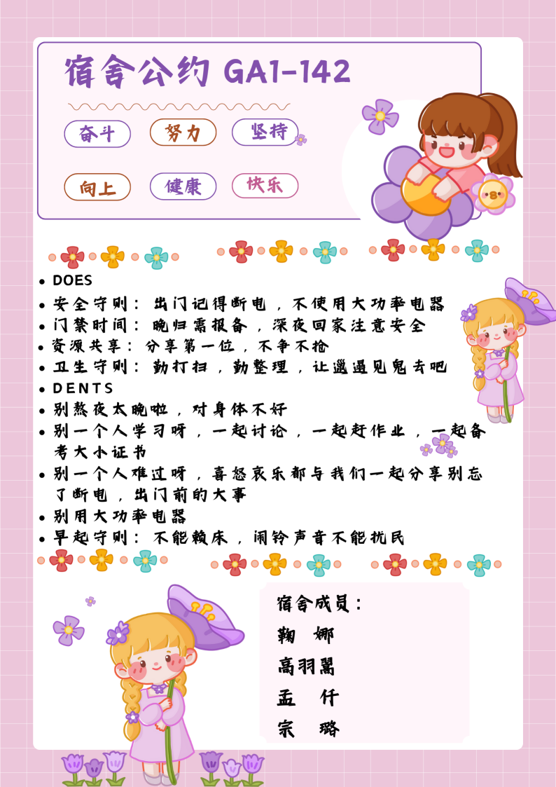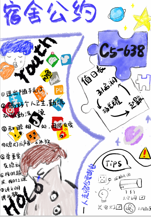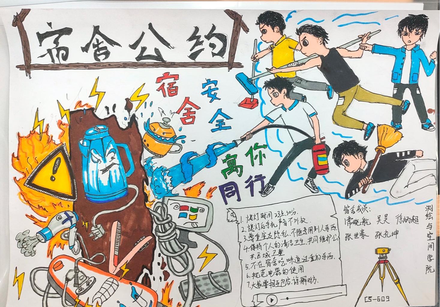 此次活动吸引了48间宿舍220余人的踊跃参与,共收到48份精美的宿舍安全文明公约设计作品。参与者们通过为各自宿舍设计并绘制宿舍公约,充分展现了他们卓越的团队协作、自我管理和自我约束的能力。这些作品不仅生动温馨,还具备启发性和实践价值。在宿舍公约设计完成后,履约情况也成为评审打分的重要考量。各寝室成员纷纷对照宿舍公约设计内容进行整改,宿舍面貌焕然一新。经评审,最终评选出一等奖5个、二等奖7个、三等奖12个。