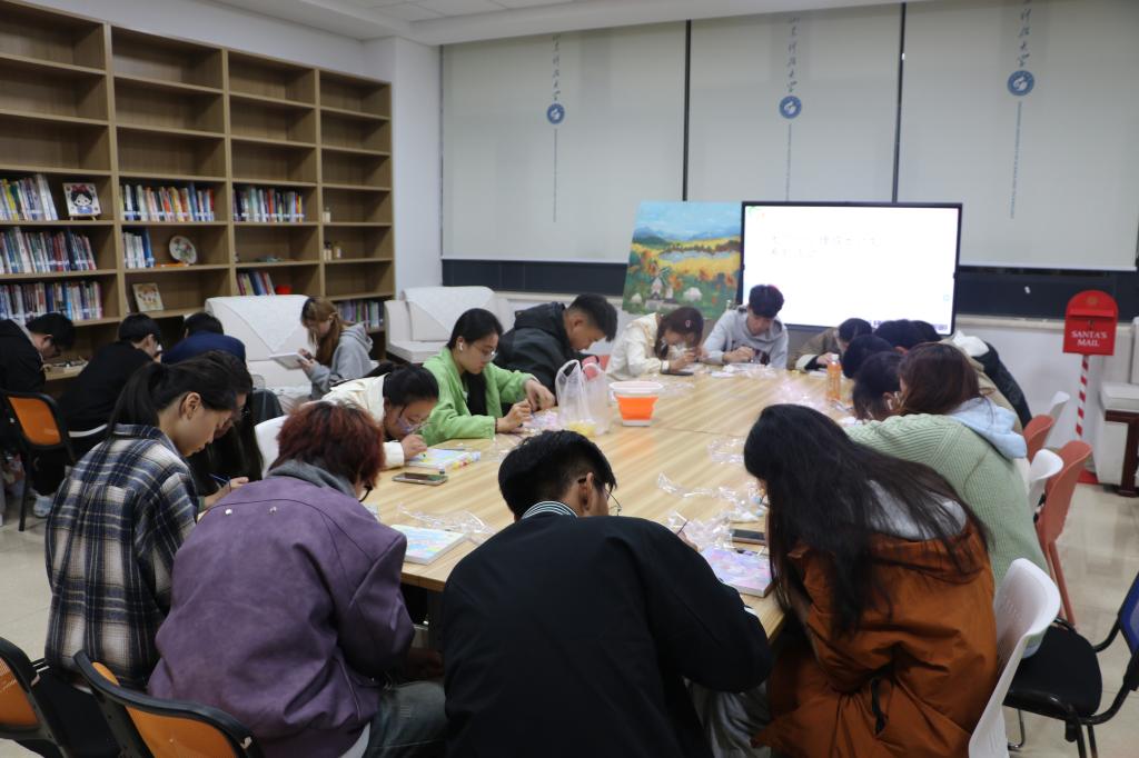活动旨在通过绘画涂色,让同学们共同开启一场探索内心世界、舒缓心灵压力的创意之旅。主持人刘议泽为同学们细心讲解绘画技巧,如揉色过渡、薄涂、点彩、羽状过渡等,简单易学的绘画方式燃起同学们的创作热情,纷纷挑选心仪画作,在欢乐的氛围中交流探讨,共同完成作品。