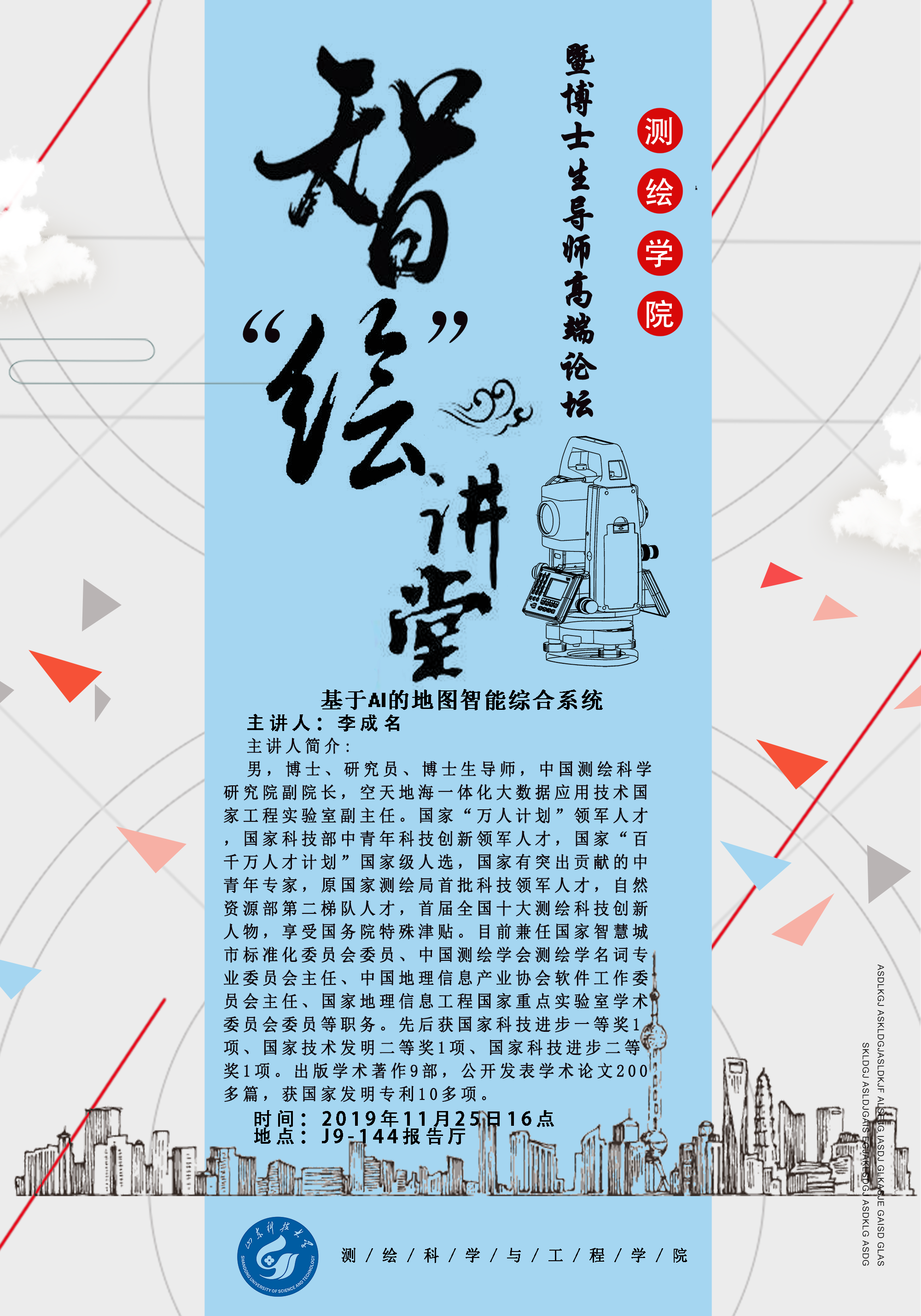 2019年11月11日下午,测绘科学与工程学院承办的第66期“名家讲坛”在J6楼434学术报告厅举办。本期名家讲坛邀请了国家测绘产品质量检验测试中心主任张继贤研究员为大家作了题为“自然资源高质量管理时代的测绘地理信息...