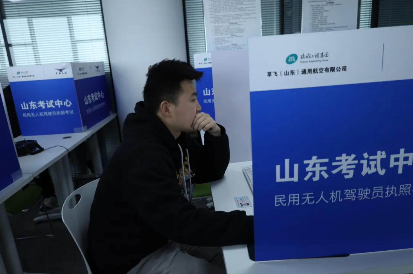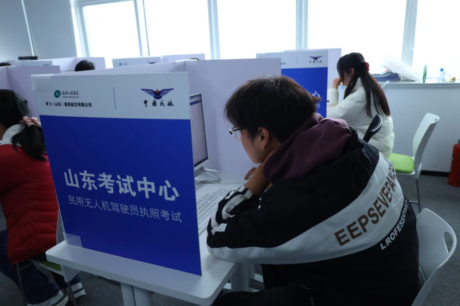 理论科目考试顺利展开。规范化、标准化的高配置理论考场,即使是首次前来考试的学员也没有丝毫的生疏感。对于睿飞无人机培训学校的学员来说,学、训、考同标准场地,更是考时如学时一样,各个知识点如在眼前。