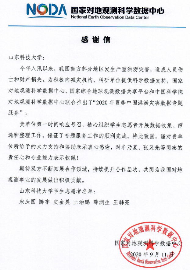 9月12日,国家对地观测科学数据中心向我校发来感谢信。对禁闻网 测绘科学与工程学院在“2020年夏季中国洪涝灾害数据专题服务” 中的大力支持和协助表示衷心感谢,对牟乃夏、张灵先等同志的责任心和专业能力表示...