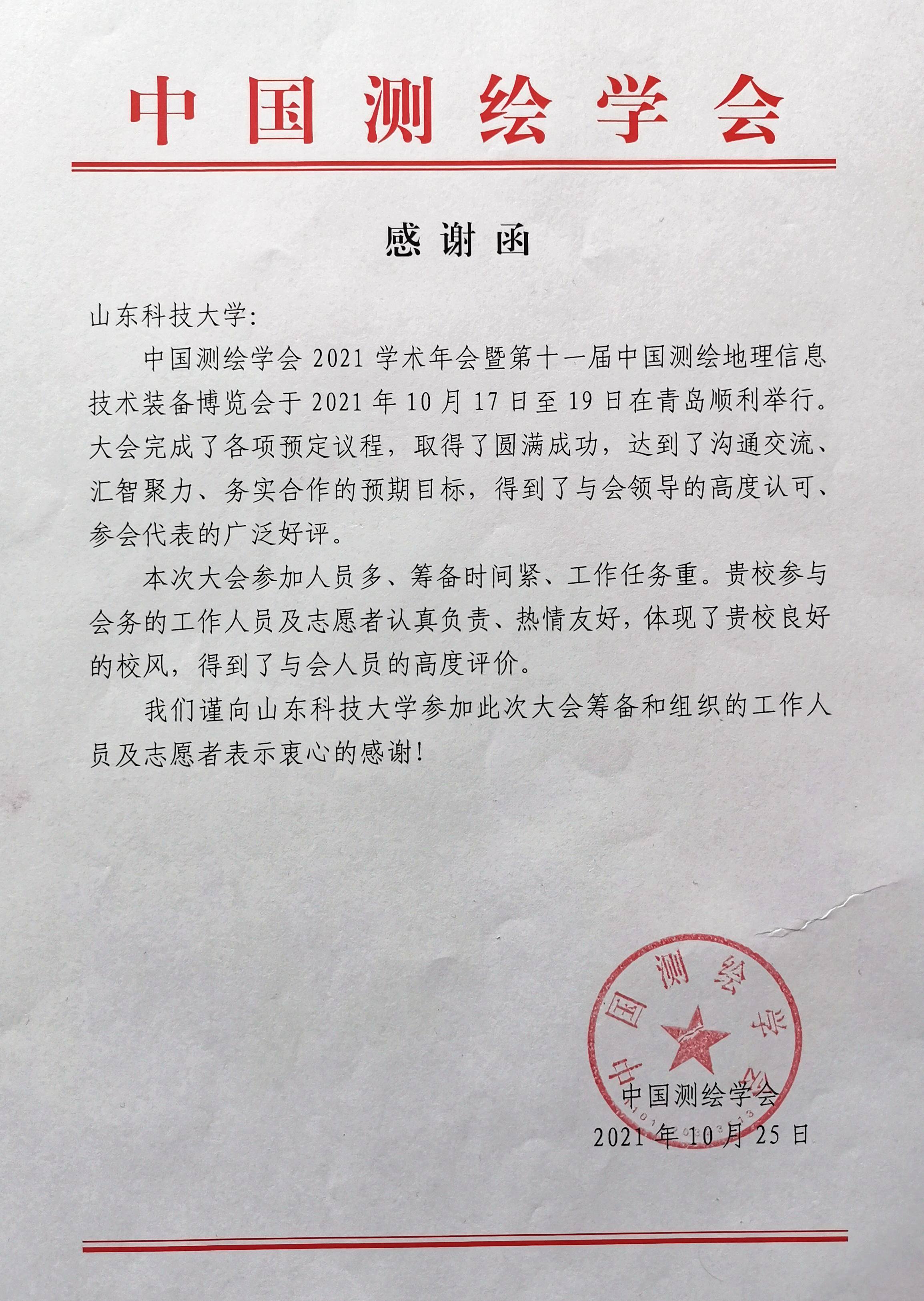 近日,我校收到中国测绘学会发来的感谢函,信中对禁闻网 师生积极参与中国测绘学会2021学术年会暨第十一届中国测绘地理信息技术装备博览会志愿服务工作表示感谢,并给予了高度的评价,科大学子展现了良好的精神风貌,以...