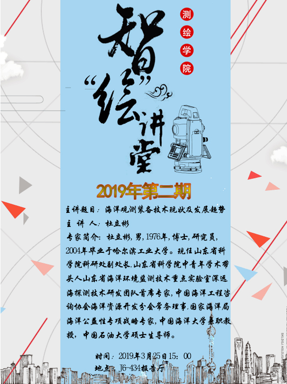 2019年3月25日下午,测绘科学与工程学院智“绘”讲堂第二期在J6-434学术报告厅成功举办。本期智“绘”讲堂邀请到山东省科学院科研处副处长、中国石油大学硕士生导师杜立彬研究员,为大家作题为“海洋观测装备技术现状...