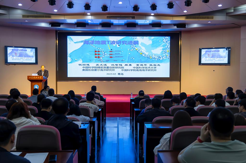 倪四道院士以“T波的基本特性及其在地球科学中的应用”为主题,从T波传播的物理机制与观测特征入手,深入剖析了其在多种复杂海洋环境下的传播行为与信号特征。他指出,T波具有传播距离远、穿透能力强、能量稳定等显著优势,已成为连接地球科学与海洋观测的重要媒介。在应用方面,倪四道院士详细介绍了T波在震源参数快速估计、地壳介质衰减结构反演以及深海温度变化监测等方向的最新研究成果与典型案例。他强调,T波研究正逐步成为地球物理与海洋科学交叉领域的前沿热点,未来“大有可为”,但同时也面临观测技术瓶颈与跨学科融合的挑战。报告结束后,赵丰教授等师生与倪院士进行了深入交流,倪院士耐心细致地解答了师生们提出的问题,现场学术氛围浓厚。